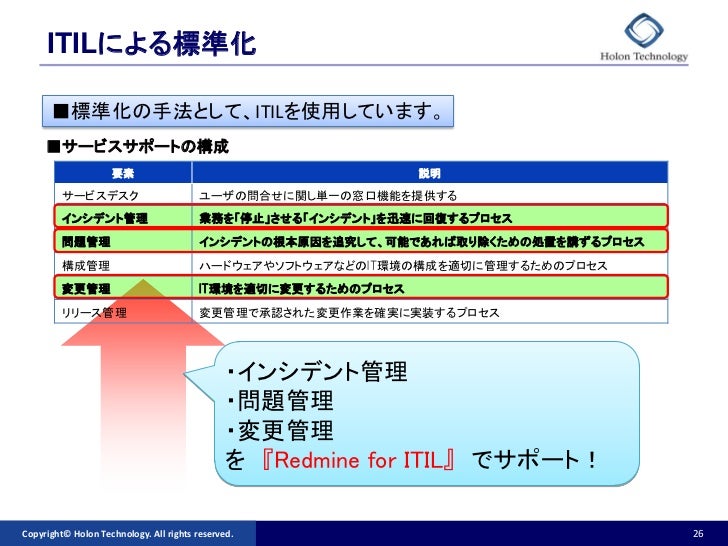 ①「インシデント管理をデフォルトに設定」 ②「順序を1に設定」 ③「変更を適用」して下さい。 ここまで設定すると、下図のように一番選びやすい位置に「インシデント管理」が設定されます。 ステップ5:インシデント管理で管理する項目を決める. Reading Time 1 minutes情報システムの運営管理における教科書として、今やほとんどの企業が認知していると言われる「ITIL® (IT Infrastructure Library)」。その中でも、ITシステムを運用する上で最も重要なプロセスのひとつとして、「変更管理」が位置付けられています。 ※ITIL® is a Registered Trade Mark of. Redmineでインシデント管理はなぜダメなのか 最近、訪問先でよく障害の管理にRedmineを使っているという話を聞くことが多いです。 個人的にもRedmineは使っていて、作業の備忘録代わりや簡易なプロジェクト管理ツールとして活用しています。 しかし、ITサービスの障害管理にRedmineを使うというのはナンセンスだと感じます。 なぜITサービスの管理に適さないのか以下.