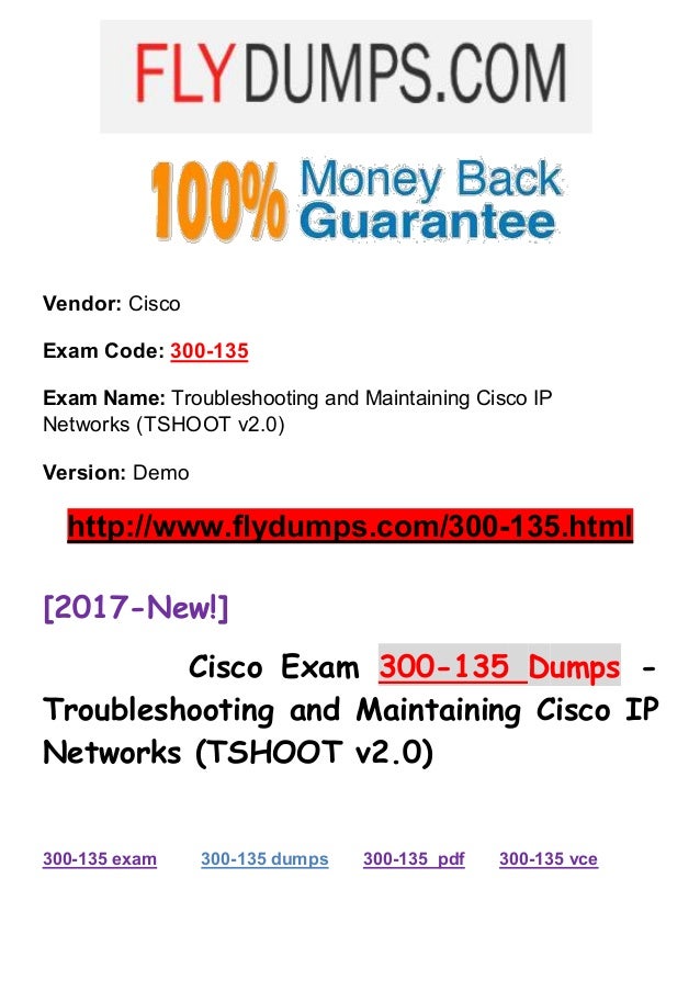 Surprising ccnp tshoot 300 135 dumps pdf May 17 300 135 tshoot We Promise Certification Provider Related Products Cisco Exam $6595 $3595 The latest actual Questions & Answers Everything you need to prepare and get best score at exam easily and quickly Detail Try 100% Secure. Fortunately, we offer the pdf demo for you Moreover, you can free download it and have a try So before you choose our study material, you can try our free demo firstly While, you should know that the questions & answers are part from the complete exam dumps, so you can just take the CCNP pdf demo as a reference. Dumps PDF If you are an IT professional and you are trying to improve your career opportunities, then you should consider clearing Cisco Troubleshooting and Maintaining Cisco IP Networks (TSHOOT) exam With the help of dumps pdf provided by Dumps4less, you can easily pass the CCNP Routing and Switching exam on your first attempt.