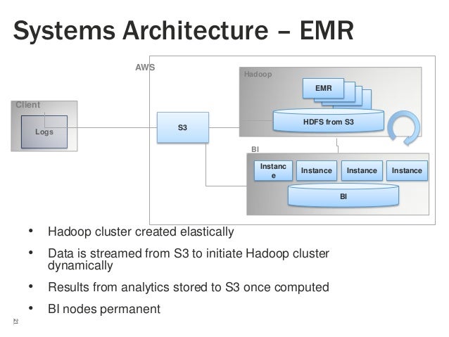 If you are considering moving your Hadoop workloads to Cloud, you’re probably wondering what your Hadoop architecture would look like, how different it would be to run Hadoop on AWS vs running it on premises or in colocation, and how your business might benefit from adopting AWS to run Hadoop. A Hadoop cluster is a collection of computers, known as nodes, that are networked together to perform these kinds of parallel computations on big data sets Unlike other computer clusters, Hadoop clusters are designed specifically to store and analyze mass amounts of structured and unstructured data in a distributed computing environment. A company is running a commercial Apache Hadoop cluster on Amazon EC2 This cluster is being used daily to query large files on Amazon S3 The data on Amazon S3 has been curated and does not require any additional transformations steps The company is using a commercial business intelligence (BI) tool on Amazon EC2 to run queries against the Hadoop cluster and visualize the data.